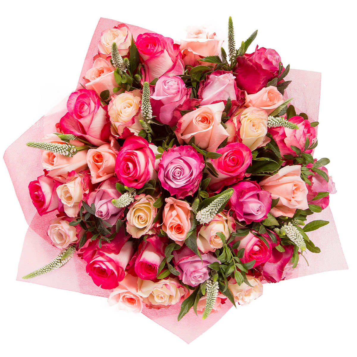 Роза одноголовая розовая и кремовая, вероника белая. Упаковка (лента, пленка, крафт, сетка, пленка матовая)