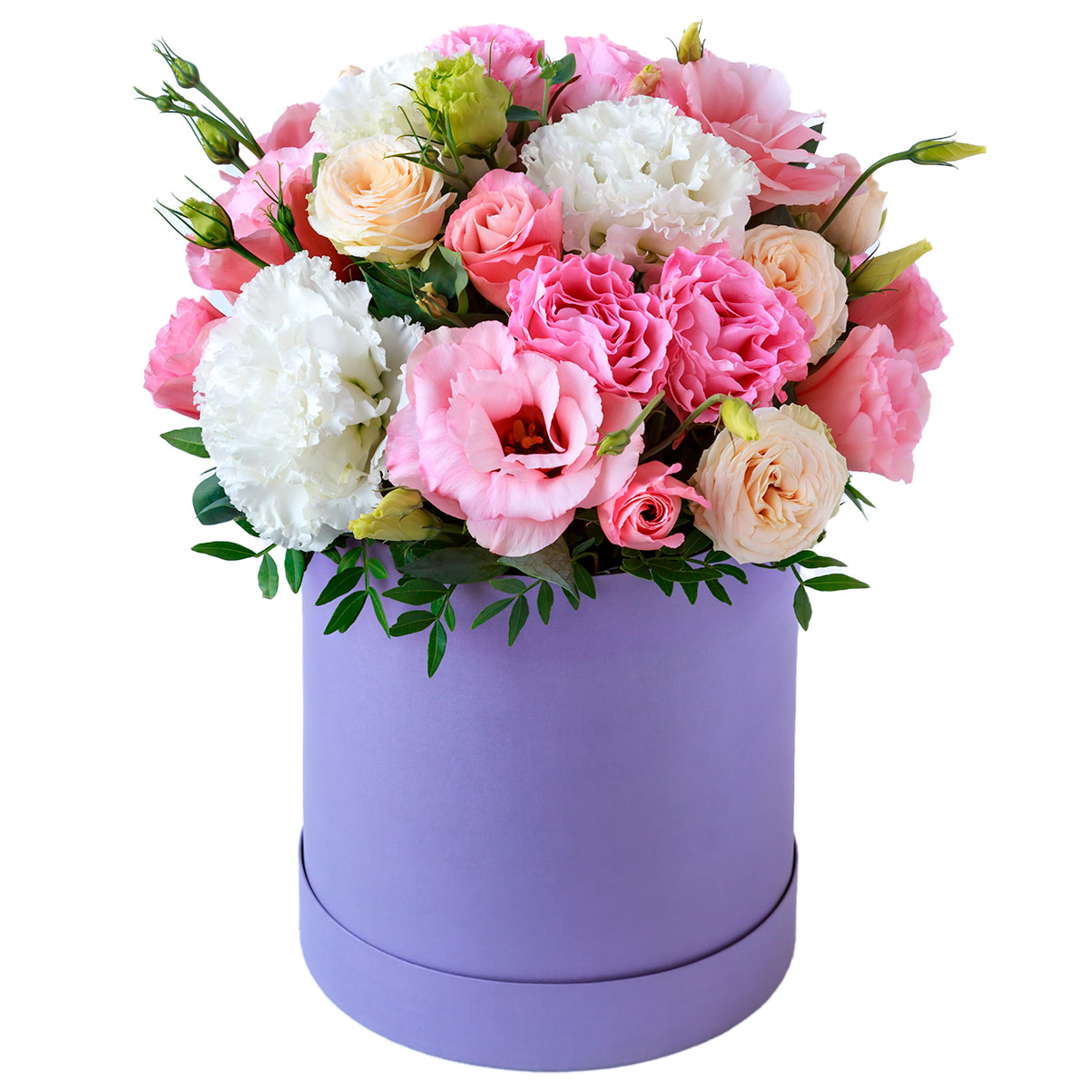 Эустома белая, розовая и зеленая, роза кустовая розовая и персиковая, зелень. Упаковка (шляпная коробка, квадратный бокс, коробка сердце, оазис)